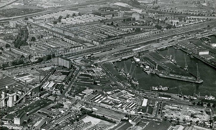 ROTTERDAM - Luchtfoto uit 1969 van Rotterdam Oud-Mathenesse, Spangen en een deel van Schiedam