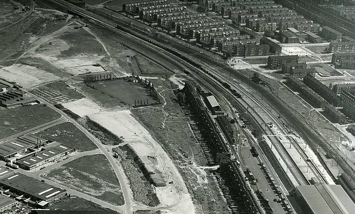 ROTTERDAM - Luchtfoto uit 1959 met rechtsonder station Schiedam-Rotterdam West