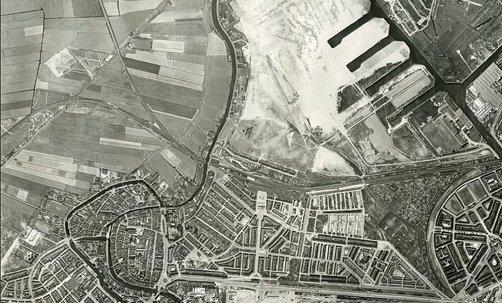 ROTTERDAM - Luchtfoto uit 1947 - De Schiedamse Schie en de Delfshavense Schie komen boven in beeld samen