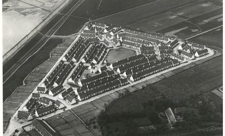 ROTTERDAM - Luchtfoto van het Witte Dorp in vogelvlucht, met rechts op de voorgrond boerderij Vreelust, en links de school voor gemeentelijk lager onderwijs. 1926