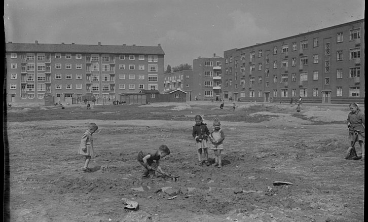 ROTTERDAM- Het Visserijplein in 1958. Deze foto is genomen vanaf de 1e Gijsingstraat. Rechts ligt de Jan Kobellstraat en frontaal de Rösener Manzstraat