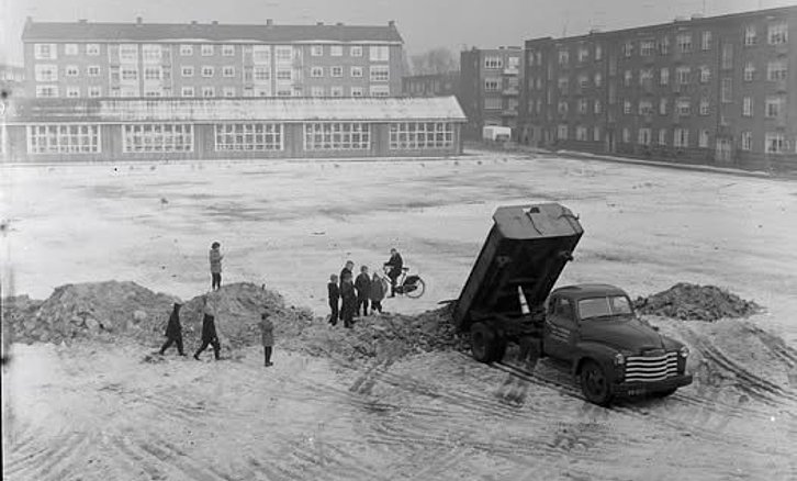 ROTTERDAM- Visserijplein in 1958. Deze foto is genomen vanaf de 1e Gijsingstraat. Rechts ligt de Jan Kobellstraat en frontaal de Rösener Manzstraat