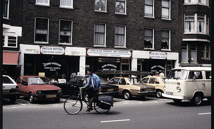 ROTTERDAM- De Grote Visserijstraat in 1987, tussen de Zoutziedersstraat en de Rösener Manzstraat. Op de achtergrond is een tweedehandswinkel