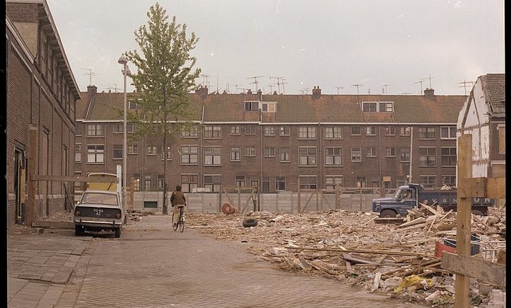 De Fabriekdwarsstraat met zicht op de achtergevels aan de Hamelstraat tijdens de sloop in 1975