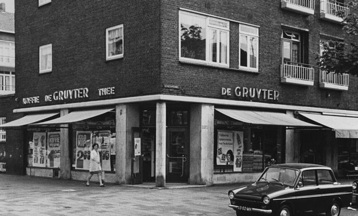 De Schiedamseweg - 1971- Filiaal levensmiddelenbedrijven De Gruyter aan de Schiedamseweg nummer 8, op de hoek van de Grote Visserijstraat