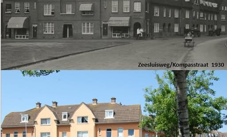 Een prachtige afbeelding gemaakt door Henk van Embden / Klik op de foto om deze helemaal te zien - Zeesluisweg-Kompasstraat in 1930 en 2024