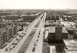1971 - De Mgr. Van Steelaan, gezien vanaf de kruising met de Hofzichtlaan in zuidelijke richting. Geheel links het zigeunerkamp aan de Rodelaan. Rechts daarvan op de achtergrond het verzogingshuis Het Anker aan de Prinses Margrietlaan. Rechts twee flats in aanbouw aan de St. Martinuslaan.