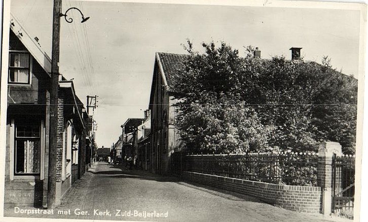 ZUID BEIJERLAND - De Dorpsstraat met de Gereformeerde Kerk eind jaren 40