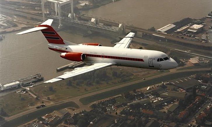 Een Fokker 70 boven Dordt en Zwijndrecht tijdens de ronde langs alle Fokker vestigingen in 1996.